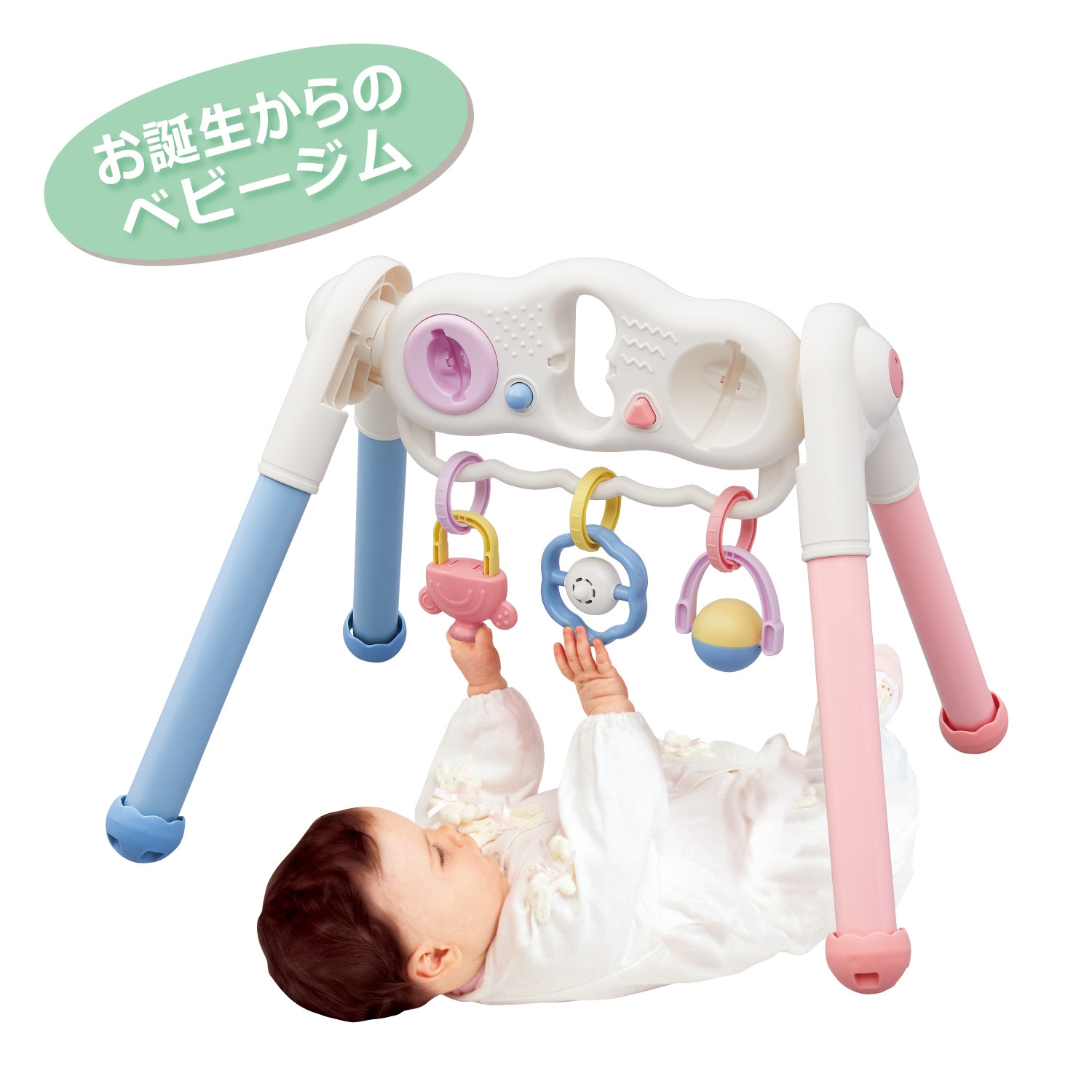 指先は「第2の脳」と言われており、指先や手を使うことで脳に良い刺激を与えると言われています。赤ちゃんは生後2か月頃になると動くものを目で追って反応するようになり、3か月頃には奥行きの知覚と目と手の協応の発達が始まり、目の前にあるおもちゃに手を伸ばすようになってきます。そのため、仰向けでいる際のベビージムは赤ちゃんの発達を促す効果が期待出来ます。しかしながら、今までのベビージムは1才頃で卒業するものが多く使用期間が短いことで購入を悩む方もいました。