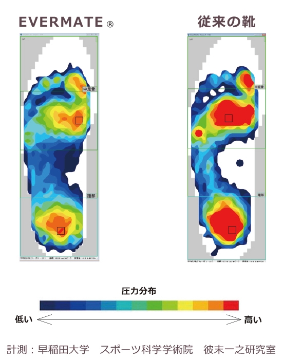 歩行中の足裏にかかる圧力をエバーメイトと従来の靴で比較・計測しました。