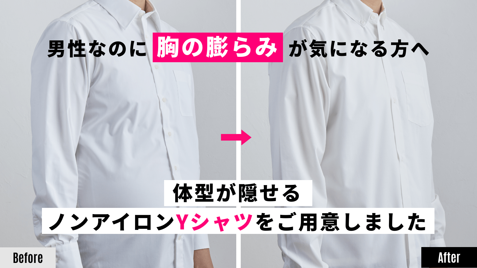 シンプルな白Yシャツを1枚で着たいと思ってはいても、「着た時の胸の膨らみが気になる」や「上着を脱ぐのが恥ずかしい」、「乳首透けが気になる」、「店舗で見た時はもっとかっこいいYシャツだったのに…」など、シンプルなだけに一枚で自信を持って着られないと、多くの男性が悩みを抱えています。