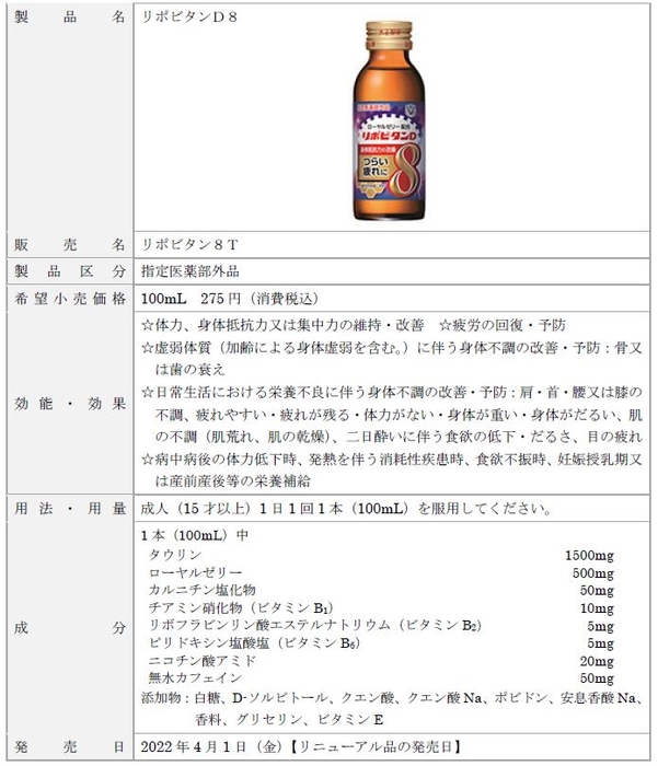 大正製薬株式会社[本社:東京都豊島区 社長:上原 茂](以下、当社)は、現代の疲れに対応した処方設計のドリンク剤「リポビタンⅮ8」とミニドリンク剤「リポビタンゴールドV」(いずれも指定医薬部外品)を発売いたします。