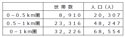 ・店舗から1㎞圏内は単身世帯比率が42.6%、2人世帯比率が24.6%と全体の7割が少人数世帯です。