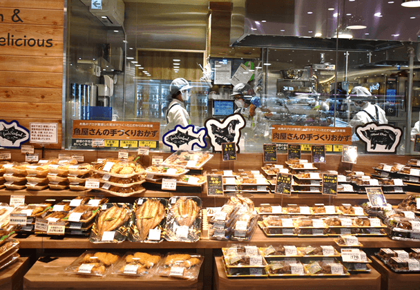 鮮度の良い旬の魚介類や、ライフオリジナルの「あまに豚」「あまに鶏」などを使用した魚屋・肉屋ならではの惣菜が並びます。
