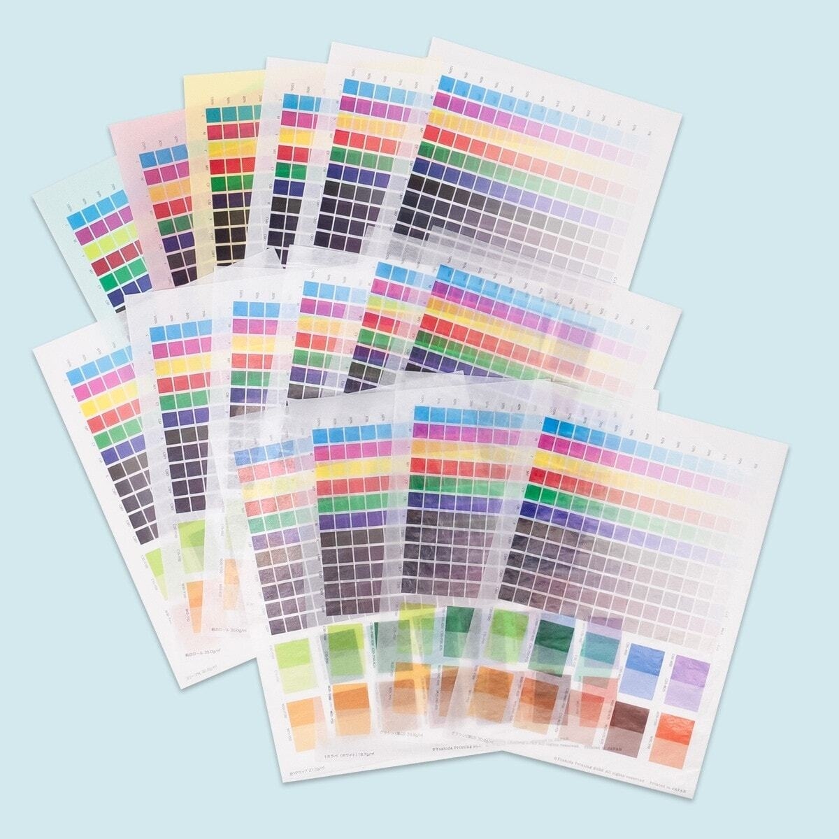 ●薄紙印刷サンプル(A5サイズ):カラーチャート柄を含む多様な16種類の薄紙素材