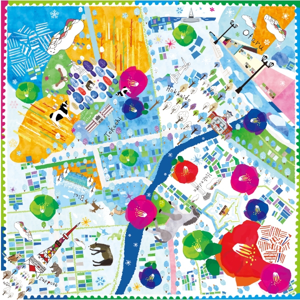 北海道の冬をめぐるように、いろいろな観光名所や自然や愛らしい動物をファンタジーに描きました。
