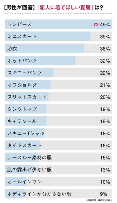 ただ、2位以下は女性が着たいランキングと異なります。2位は「ミニスカート」、3位は「浴衣」、4位は「ホットパンツ」です。女性のランキングで上位に上がっていた「肌の露出が少ない服」「ボディラインが分からない服」は、それぞれ13位と15位と、人気がありません。