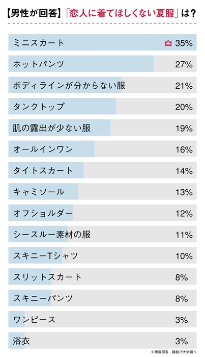 女性が着たい夏服の中で、男性が「恋人には着てほしくない」と思っている服も選んでもらいました。