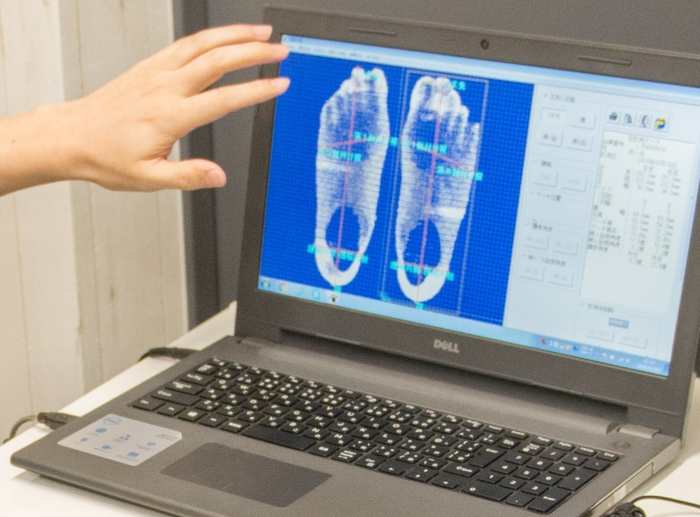 当サロンでは、医療現場でも使用されている3次元足型測定器を導入し、足の状態を「見える化」しています。数値化することにより一人ひとりに合わせた施術プログラムの作成やオーダーインソールの製作までを実現いたします。