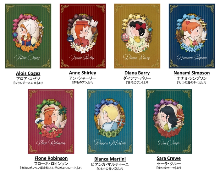 優しく賢く、時には逞しく。世界名作劇場にはいつも強く美しい「ヒロイン」達がいました。真っ直ぐに未来を見据えた横顔を囲むように、フレームにはそれぞれの物語に由来したアイコンを、胸元にはそれぞれのキャラクターをイメージした花をあしらいました。