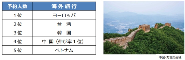 人気旅行先ランキングは、1位 近畿、2位 北陸・甲信越、3位北海道でした。伸び率では、1位 近畿、2位 東海、3位 沖縄となっており、近畿、沖縄と話題性の高い方面の伸びが目立っています。また、長期滞在や祭りなど、テーマのある旅や体験型の旅への需要も高まっています。