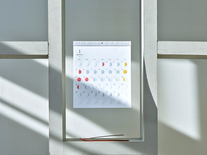 累計1万部の売上を達成した、月の満ち欠けがモチーフの壁掛けカレンダーです。エンボス加工で月のシルエットを表現しています。土曜と日曜の休日部分には季節をイメージした色を施しており、月ごとに色の変化をお楽しみいただけます。ムーンカレンダーにはめずらしい、紙の白地を生かしたシンプルなデザインなので、リビングはもちろん、子供部屋、オフィスにもマッチします。ヨガやサーフィンなどの趣味、体調管理などライフスタイルに月の満ち欠けを取り入れている方たちから評価をいただいています。海外ではリプラグのアイテム全体を通し、一番の売れ筋商品です。