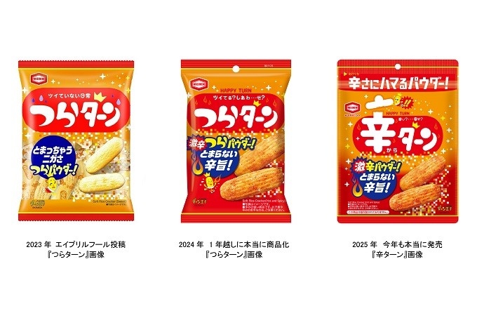 2023年のエイプリルフールに、ハッピーターン【公式】Xアカウント(@happyturnkameda)から投稿した「つらターン」の大きな反響を受けて、昨年2024年のエイプリルフールには、「嘘から出たまこと」として『つらターン』が1年越しに商品化されました。Xでは、「これはエイプリルフール?ガチ?」「ネタかと思ってたらほんとに売ってた」等多くの反応をいただき、1.3万リポスト、4万いいねを獲得する等大きな話題を生み出しました。