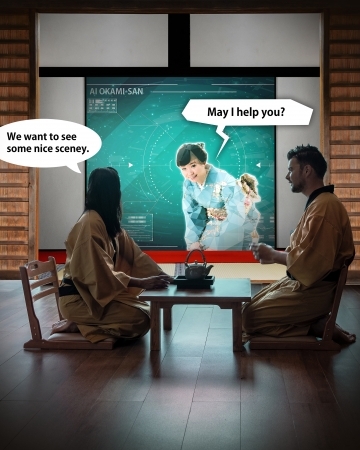 ②老舗旅館のモニターに映る「女将さん アバター」とお客様による周辺観光施設の質問・説明