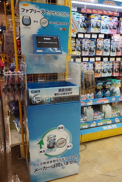 回収ボックスは、全国のオートバックス・スーパーオートバックスの563店に設置されます。また、回収量、リサイクル率を高めるために、プラスチック製のクルマ用消臭芳香剤であれば、ファブリーズブランド以外の他メーカーの消臭芳香剤も回収の対象とします。