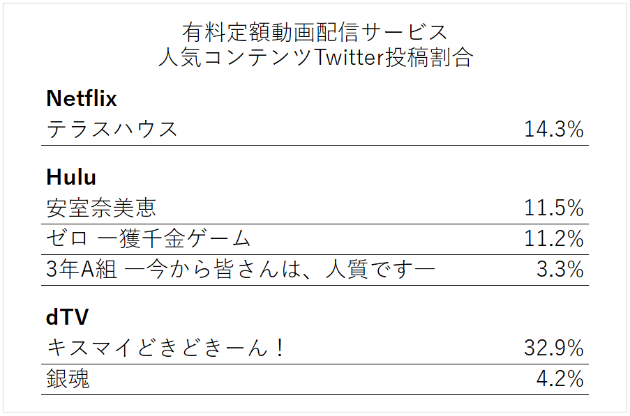 定額動画配信サービス各社のTwitter投稿の中からコンテンツ(番組)の投稿割合(シェア)を調べました。