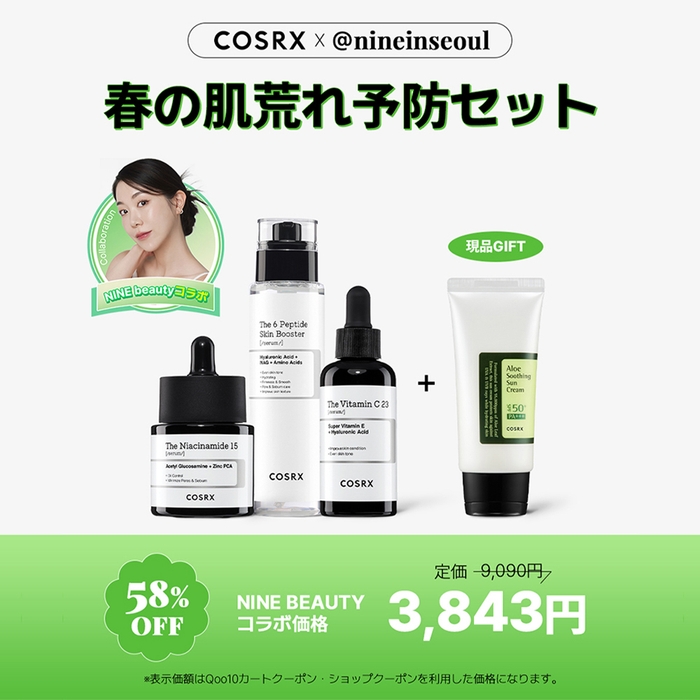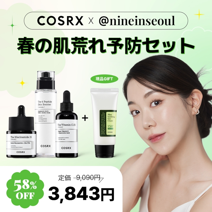 人工香料を使用せず、お肌に必要な成分だけを最大限有効に配合し、敏感な肌にもお使いいただけるダーマスキンケアブランドCOSRXより、乾燥や肌荒れが気になる方のために韓国在住美容インフルエンサーとして日本で大人気を集めている”Nine beauty”さんとのコラボセット「春の肌荒れ予防セット」を企画しました。