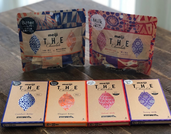 新商品アソートの発売開始に伴い、アソートに含まれる明治 ザ・チョコレート「コンフォートビター」、「エレガントビターー」、「ベルベットミルク」、「サニーミルク」の4種類のお味をリニューアルいたしました。