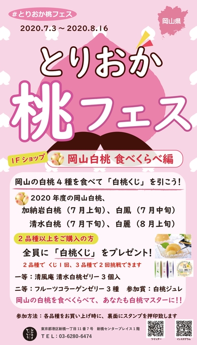 鳥取県・岡山県共同アンテナショップ「とっとり・おかやま新橋館」では、桃のお祭り!その名も「とりおか桃フェス」を開催します(7月3日~8月16日(予定))。
