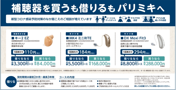 月額税込3,300円~ 定額にて補聴器を貸し出しいたします。使えるようになるか不安な方は、まずは補聴器を借りることから始めてみませんか? また、ご購入をご希望の場合は両耳84,000円(非課税)~ お求めいただけます。