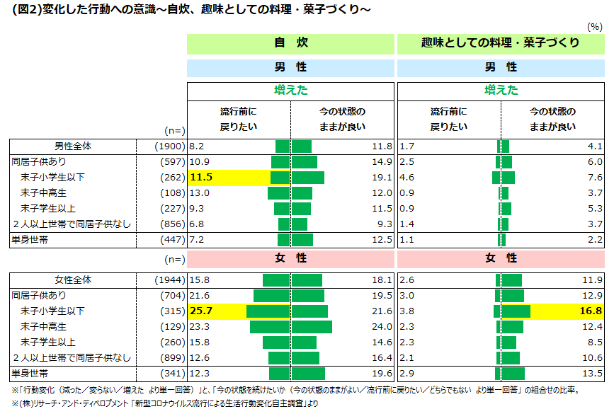 「自炊」が増えたことに対して、小学生以下の子供を持つ父親層では、「今のままが良い」が「流行前に戻したい」を上回るが、逆に母親層では流行前に戻したい割合が多い。ただし、この層は「趣味としての料理・菓子づくり」が増えたことに対しては、現状維持を望んでおり、“義務として”の料理には消極的だが、“趣味として”の料理には積極的な様子が窺える。