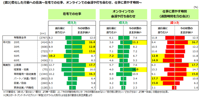 増加した「在宅勤務」に対して、20~40代は今後も現状のままでいいとする割合が多いのに対し、50代では流行前に戻したいとする人の方が多い。また、オンライン会議が増えたことについても、20~30代は続けたいとする人の方が多いが、50代は以前に戻したいとする方がやや多い。50代を境に、新しい働き方への考え方に格差が生じている。