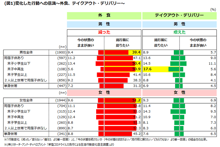 新型コロナウイルスの流行による行動の変化と、今後その状態を続けたいかを聞いたところ、外出自粛により減った「外食」を、今後は戻していきたい(流行前に戻したい)と回答した人は全体で35%であった。特に女性は51%と、男性の39%より10ポイント高い。一方、「テイクアウトやデリバリー」は、流行前より増えたものを減らしたい(流行前に戻したい)という人が多い。