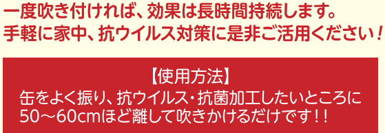 使用方法:缶をよく振り、抗ウイルス・抗菌加工したいところに50~60cmほど離して吹きかけます。一度施行すれば半年以上の効果が期待されます。