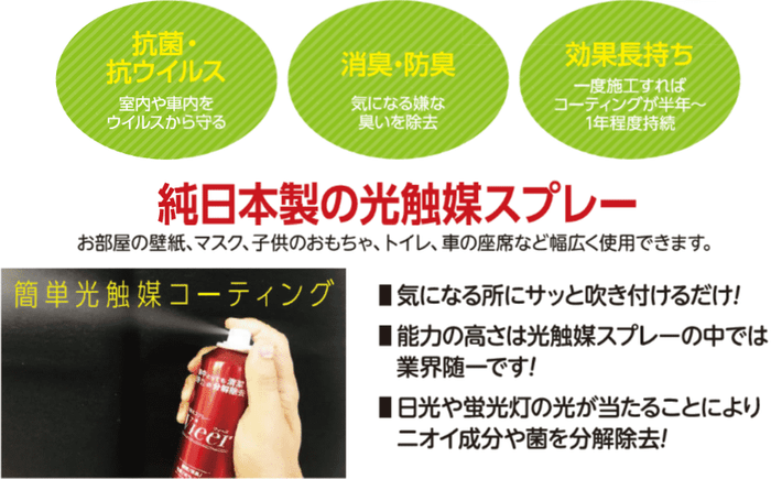 抗菌したいところに吹きかけるだけ!光触媒スプレー界で随一の能力をお試しください!