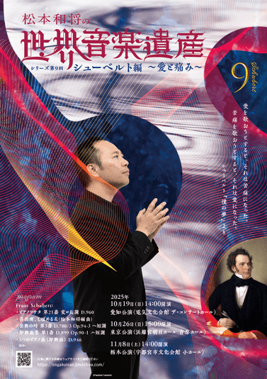 世界音楽遺産実行委員会主催『松本和将の世界音楽遺産 シリーズ第9回 シューベルト編 〜愛と痛み〜』が2025年秋、愛知、東京、栃木で開催されます。