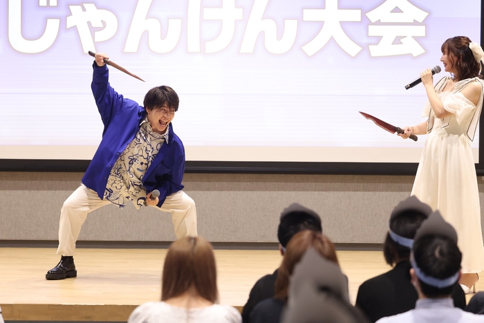 そしてイベントも終盤に差し掛かりユニークシナリオ「じゃんけん大会」のコーナーへ。以前から作品公式Xにてその存在のみ告知されていた「じゃんけん大会」。詳細が明かされないままイベントを迎えたファンたちに司会から、内田さんとのじゃんけんに勝利し続け残った最後の1人には内田さんが演じる主人公・サンラクの装備武器“致命の包丁(レプリカ)”が贈られることが発表され、会場のボルテージは最高潮に。白熱した勝負が続き大盛り上がりで「じゃんけん大会」は幕を閉じました。