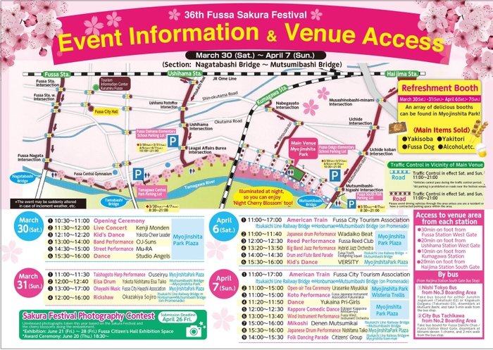 今年で36回目を迎える桜まつりは、開催期間中の土曜、日曜は多摩川堤防沿いの明神下公園をメイン会場とし、民踊パレードやダンス、演奏などのイベントや地元町会、自治会による模擬店が出店され、まつりを盛り上げます。開催期間中は、午後5時~午後9時まで夜間ライトアップも実施して、夜桜も楽しめます。