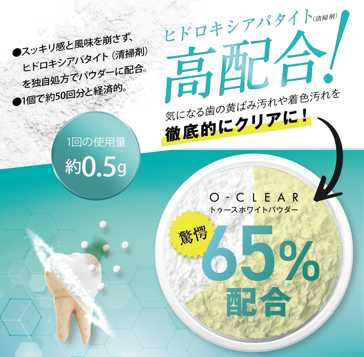 歯と同成分、ヒドロキシアパタイト(清掃剤)を独自処方でパウダーに高配合。細かい粒子が歯の隅々まで入り込み歯垢を除去。気になる口臭予防にも。