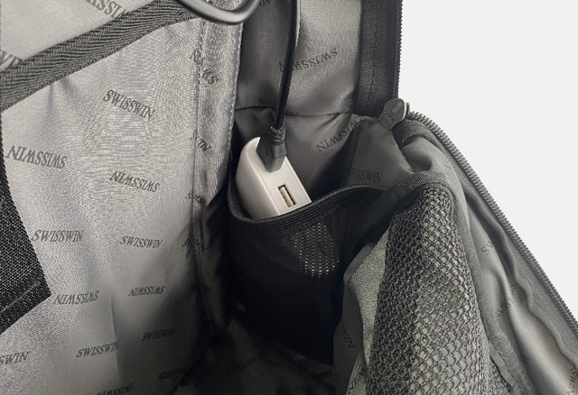 小物用のポケット、中央にはファスナーポケット、小物ポケット、ペン差し、メインルームにはメッシュポケット、クッション付きの2弾ポケットがついています。右側側面にはお持ちのバッテリーなど収納できるポケットが付属、本体外側の側面から続いているUSBコネクターと接続し充電出来ます。
