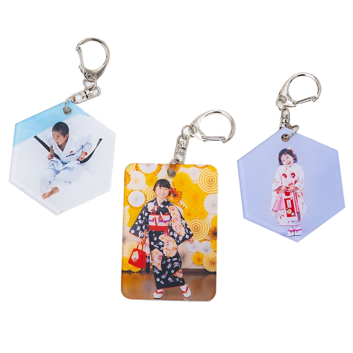 高級感のある両面アクリルチャームで、六角形または長方形の2つから形を選ぶことができるアクリルキーホルダーです。