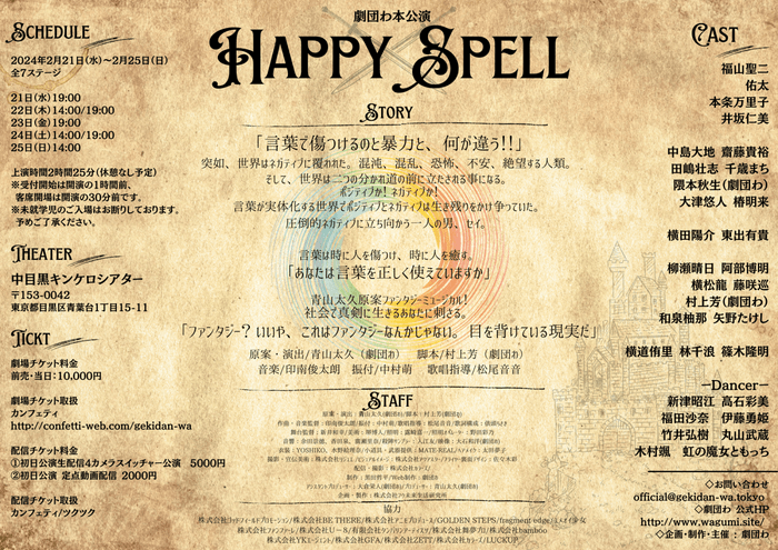 劇団わ(代表:青山太久)主催、ミュージカル『Happy Spell』が2024年2月21日 (水) ~2024年2月25日 (日)に中目黒キンケロシアター(東京都目黒区青葉台1-15-11)にて上演されます。