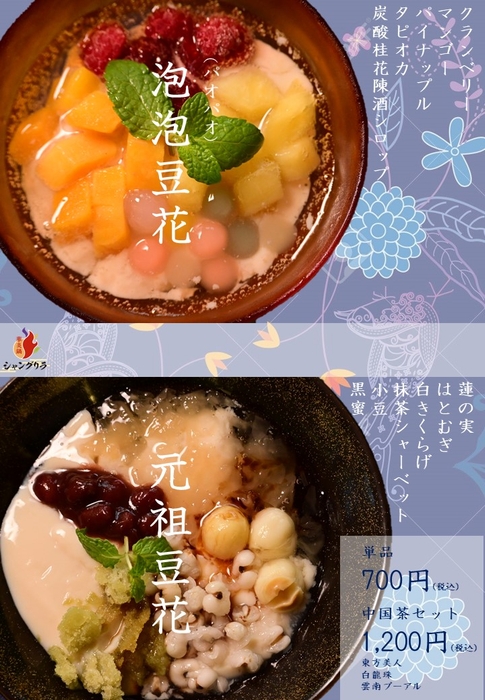 新メニューの『豆花』には、淡路島産の無添加ドライフルーツを贅沢に入れた『元祖豆花』、『泡泡豆花』の2種類をご用意しました。『元祖豆花』は、蓮の実・ハトムギ・白きくらげなどを使用し、豆腐よりも柔らかく、ゼリーのようなトロっとした食感が特徴のベーシックな豆花です。『泡泡豆花』は、クランベリーやマンゴーなどのフレッシュなフルーツにカラフルなタピオカをトッピング。桂花陳酒(白ワインにキンモクセイの花を3年間漬け込んだ中国のお酒)を使ったシロップを炭酸水で割り、シュワシュワとした口当たりをお楽しみいただける見た目も華やかな新感覚の豆花です。