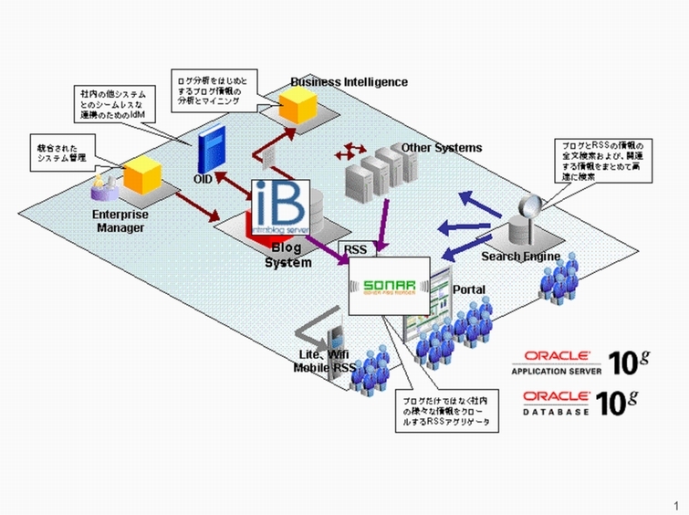 今回、日本オラクルは、社内の他システムも含めたID管理を一元的に行うことができるディレクトリ・サーバー「Oracle Internet Directory」や、ブログだけではなく社内すべてのデータも含め一元的に検索可能な全文検索システム、エントリ内容を分析し、経営に生かすためのビジネスインテリジェンス「Oracle Business Intelligence」、そしてシステムを一元的に管理し障害ポイントの迅速な発見や対処が可能となる「Oracle Enterprise Manager」など、統合ミドルウェア環境「Oracle Fusion Middleware」を提供します。日立は、イントラネットの中でブログ型の情報発信を容易にするイントラブログサーバ「iB」と、社内のブログサーバをはじめとして今後各種システムから送り出されることが予想されるRSSデータを収集するRSSリーダー&クローリングサーバの「SONAR」をそれぞれ提供し、両社のシステムの相互接続についての技術的検証を行います。この成果により、新しいブログ環境を実現できるソリューションとして提供し、より広範囲で、かつ多様な企業内情報の共有が可能となります。