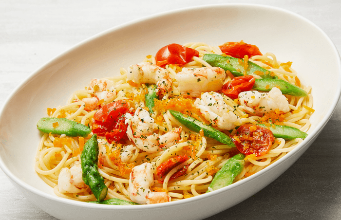 プロントの季節限定パスタ「天然赤海老と夏野菜のペペロンチーノ」は、天然赤海老の美味しさがぎっしり詰まったプロントの季節限定パスタです。大ぶりの赤海老にセミドライトマト、アスパラと見た目も鮮やかなペペロンチーノは、赤海老と夏野菜の旨みを引き立てた贅沢な一皿。食欲そそる彩り豊かな夏のパスタです。