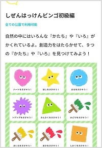 公園で親子でお散歩しながら自然観察ができちゃうコンテンツです。自然の中にかくれている、いろいろな形や色、9種類を探します。
