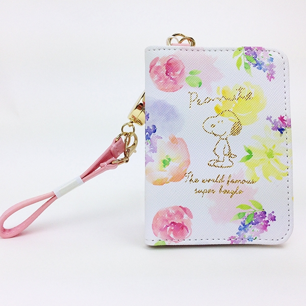 ふんわりとしたやさしい花柄のパスケースは、スヌーピーの型押しが上品でかわいい♡