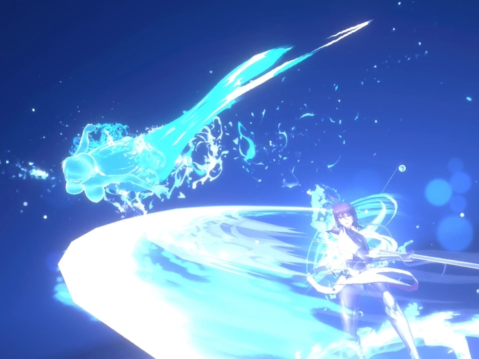 通常攻撃を強化するスキル「対魔殺法:流水」を装備すると、通常攻撃の最後に水遁の武器を召喚、さらに広範囲の敵に追撃を与えることができる。