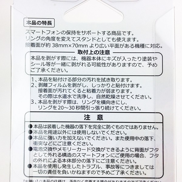 装着する際などは、注意事項をご覧になって、貼り付けてくださいね。マルチリングなので、スマホに限らず用途もいろいろです。