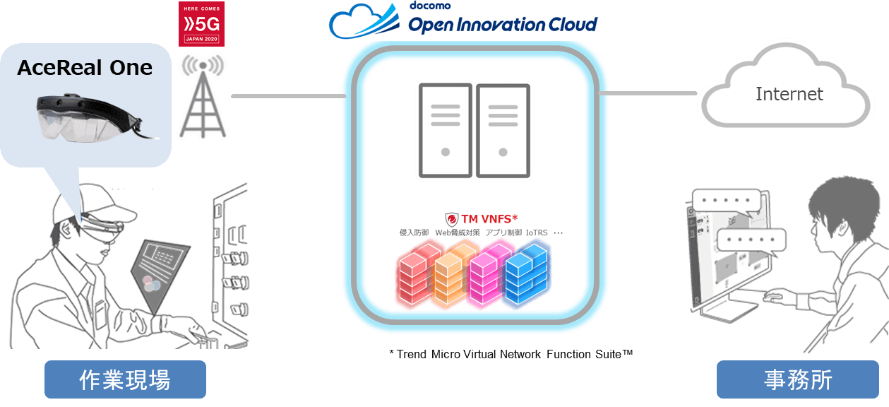サン電子様が提供するクラウド型業務支援アプリケーション「AceReal Apps」とトレンドマイクロが提供する「Trend Micro Virtual Network Function Suite」がドコモオープンイノベーションクラウドで協創することで、「AceReal Apps」やARスマートグラス「AceReal One」に対する外部からの不正な操作や脆弱性を突いた攻撃を防ぐことができます。