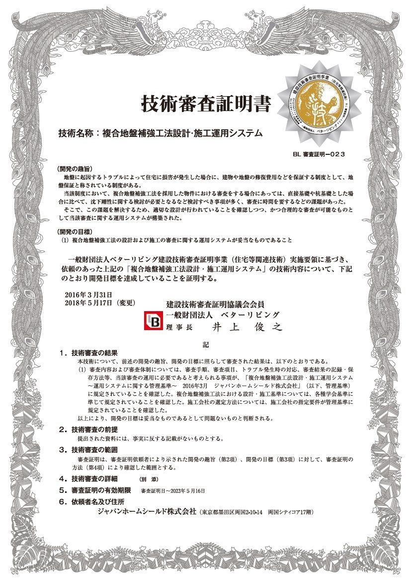 『環境パイル工法』工法追加にあたり、一般財団法人ベターリビングにおける審査委員会を経て技術審査証明を受けております。