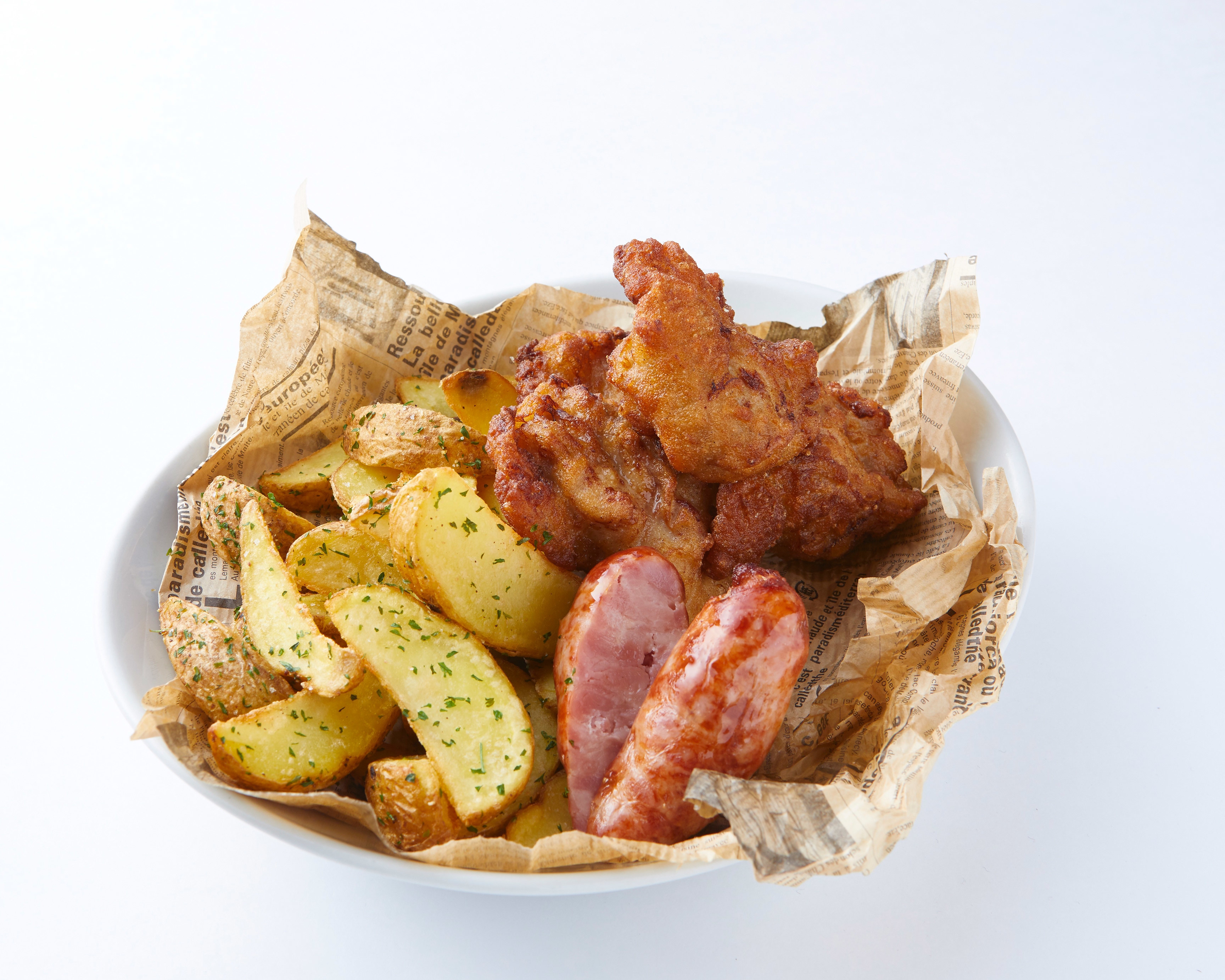 人気のイタリアンチキン、パンチェッタソーセージ、皮付きフライドポテトを盛り合わせに。