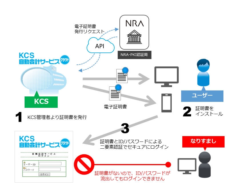 そこでNRAはKCSと、「KCS自動会計サービス クラウド」に「NRA-PKIクライアント証明書」を標準搭載することを検討し合意しました。「NRA-PKIクライアント証明書」の導入により、ID/パスワードが盗まれた際の第三者によるなりすましログインの防止や、万が一端末を紛失した際でも管理者が対象端末の証明書を失効させることで不正なアクセスを制限できます。