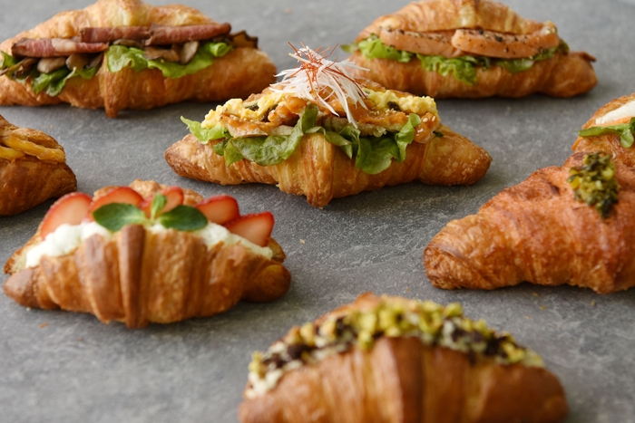 おすすめはクロワッサンド。サクッとした歯触りはそのままに、食べる時にパイ生地がこぼれにくいパンをコンセプトに作りました。メニューは常時7種類(2週間ごとにメニューを変更する予定)。その他スープ、ドリンクもご用意しています。