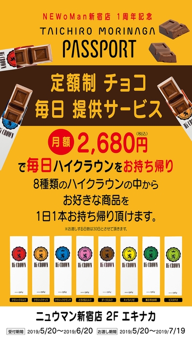 「TAICHIRO MORINAGA PASSPORT」は月額2,680円をお支払いいただくと、お好きな「ハイクラウン」を1日1本お持ち帰りいただける定額制のチョコレート毎日提供サービス(サブスクリプション)です。