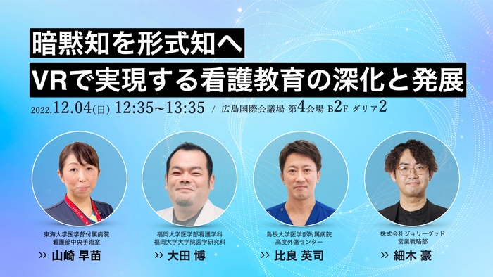 株式会社ジョリーグッド(東京都中央区、代表取締役:上路健介、以下 ジョリーグッド)は、2022年12月3日〜4日に広島で開催される「第42回日本看護科学学会・学術集会」のセミナーにて、AMED研究事業(*)の一環として福岡大学(福岡県福岡市、学長:朔啓二郎)と共同開発した「看護基礎教育VR」を初公開いたします。本セミナーはVRゴーグル100台同時接続の大規模医療セミナーとなります。