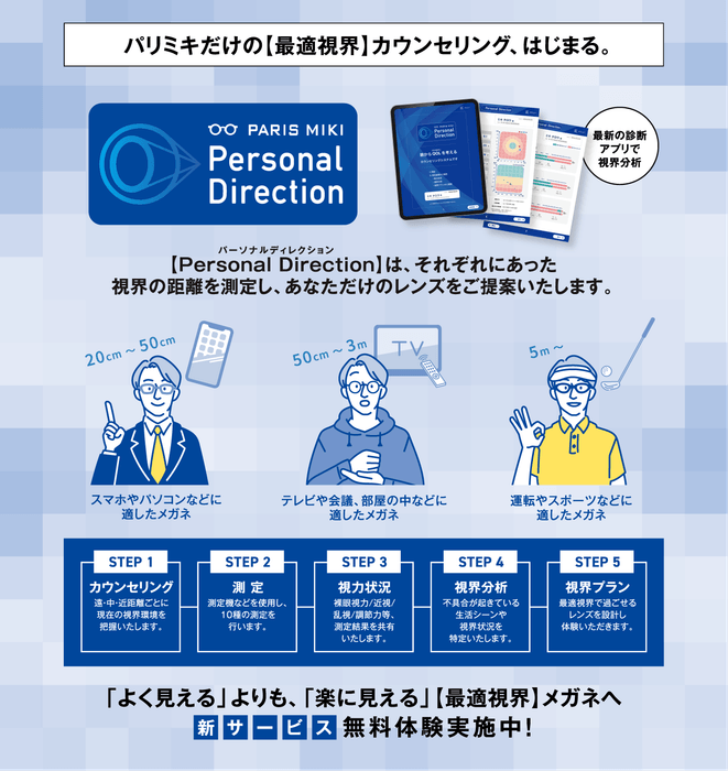 パリミキでは単に視力を上げるのではなく、生活のそれぞれのシーンに適した見え方【最適視界】で暮らすという考え方をおすすめしています。お一人おひとりの生活シーンに合わせたパーソナル対応型カウンセリング【Personal Direction(パーソナルディレクション)】では、それぞれにあった視界の距離を測定し、あなただけのレンズをご提案いたします。