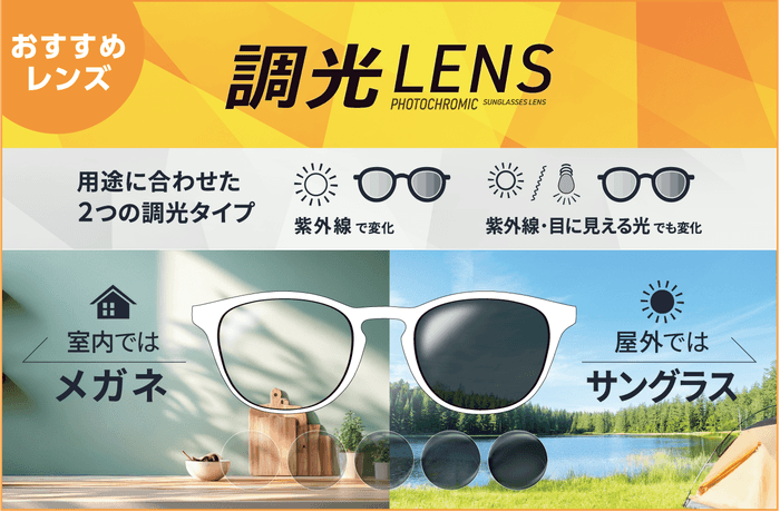 室内ではメガネ、屋外ではサングラスとして、掛け外しの手間が不要な1本2役のレンズです。紫外線で変化するタイプ、紫外線と目に見える光でも変化をするタイプどちらもご用意しています。